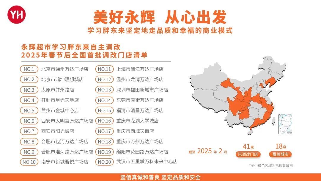 2月11日,永輝官方發(fā)布首批調(diào)改門(mén)店20家,覆蓋武漢、太原、南寧、開(kāi)封等15個(gè)城市,其中8個(gè)城市為首次納入調(diào)改范圍。此次調(diào)改不僅延續(xù)了2024年 “學(xué)習(xí)胖東來(lái)” 的核心策略,更將覆蓋城市從鄭州、北京、重慶等18城擴(kuò)展至26城,試圖通過(guò)優(yōu)化商品結(jié)構(gòu)、重塑門(mén)店場(chǎng)景和提升服務(wù)體驗(yàn),帶動(dòng)區(qū)域商圈消費(fèi)升級(jí)。