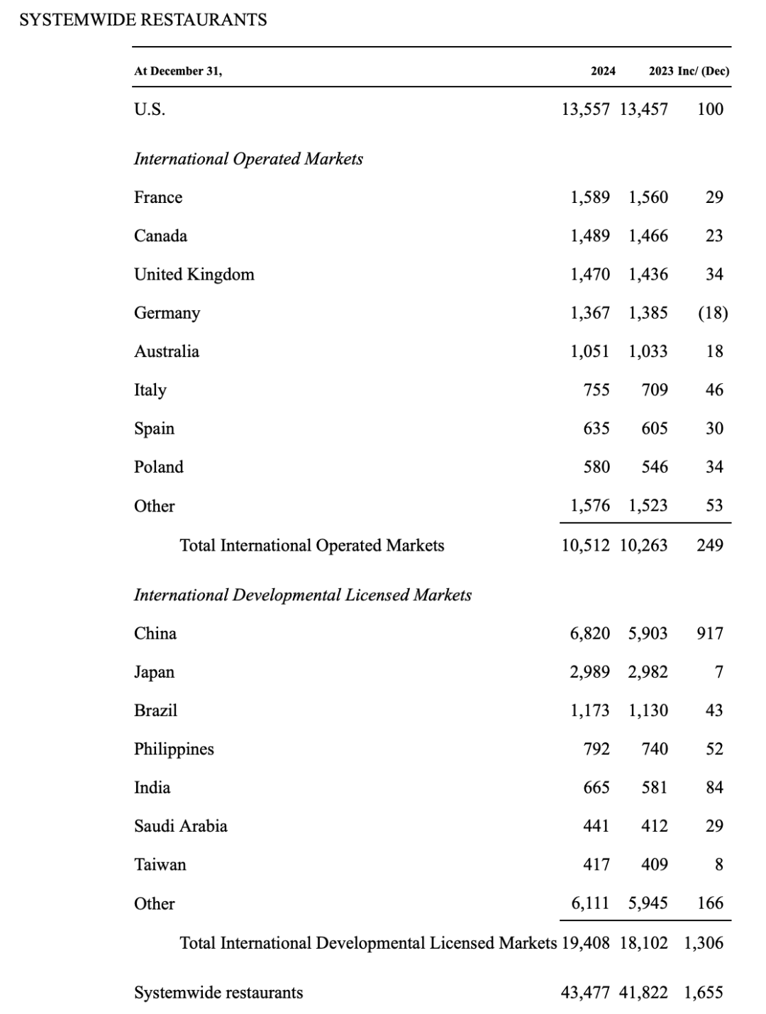 全球門店布局截至2024年底,麥當勞全球門店總數(shù)從2023年的41822家增長至43477家,共增加了1655家。