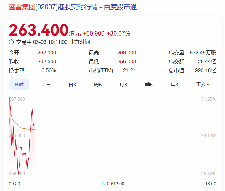 2025年3月3日,港交所的銅鑼聲準(zhǔn)時響起,標(biāo)志著蜜雪冰城股份有限公司(股票代碼:02097)正式上市。上市首日,股價高開超29%,報262港元/股,發(fā)行價則為202.5港元/股。至此,蜜雪冰城以980億港元的總市值,躍居全球現(xiàn)制飲品上市公司的龍頭位置。