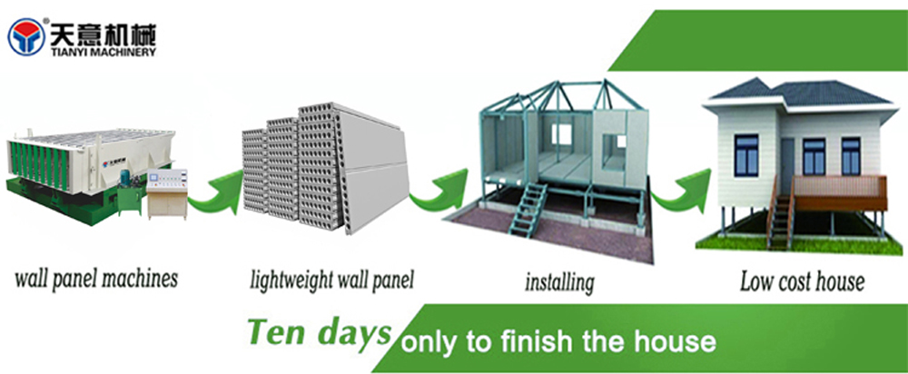 EPS cement wall panel production line is the new wall panel production line developed by our company according to domestic and foreign advanced technology and experience. The production line mainly consists of automatic batching system, mixing system, foaming system, power distribution system, wall panel molding system, slurry pumping system, EPS pre-expanding system, hydraulic circulation system, overall board drawing system, etc.