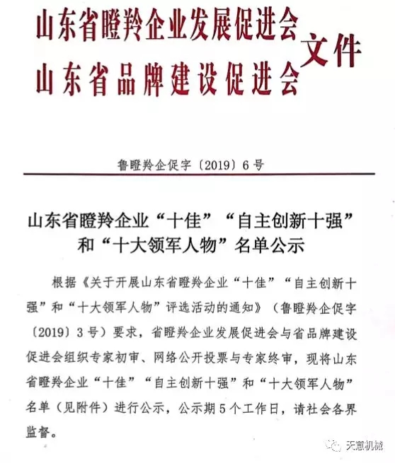 根據(jù)《關(guān)于開展山東省瞪羚企業(yè)十佳”“自主創(chuàng)新十強(qiáng)十大領(lǐng)軍人物評選活動的通知》(魯?shù)闪缙蟠僮帧?/span>20193號)要求,2019126日,山東省瞪羚企業(yè)發(fā)展促進(jìn)會、山東省品牌建設(shè)促進(jìn)會發(fā)布魯?shù)闪缙蟠僮?/span>[2019]6號文,公布經(jīng)過專家初審、網(wǎng)絡(luò)公開投票與專家終審,評選出了山東省瞪羚企業(yè)十佳自主創(chuàng)新十強(qiáng)十大領(lǐng)軍人物。天意機(jī)械榮獲“山東省十佳瞪羚企業(yè)”稱號。